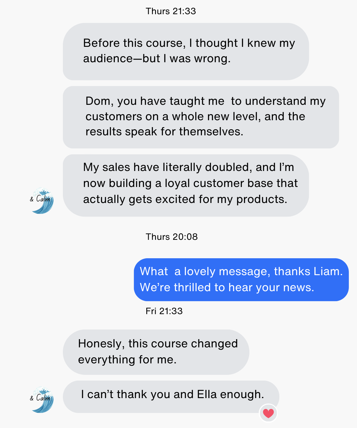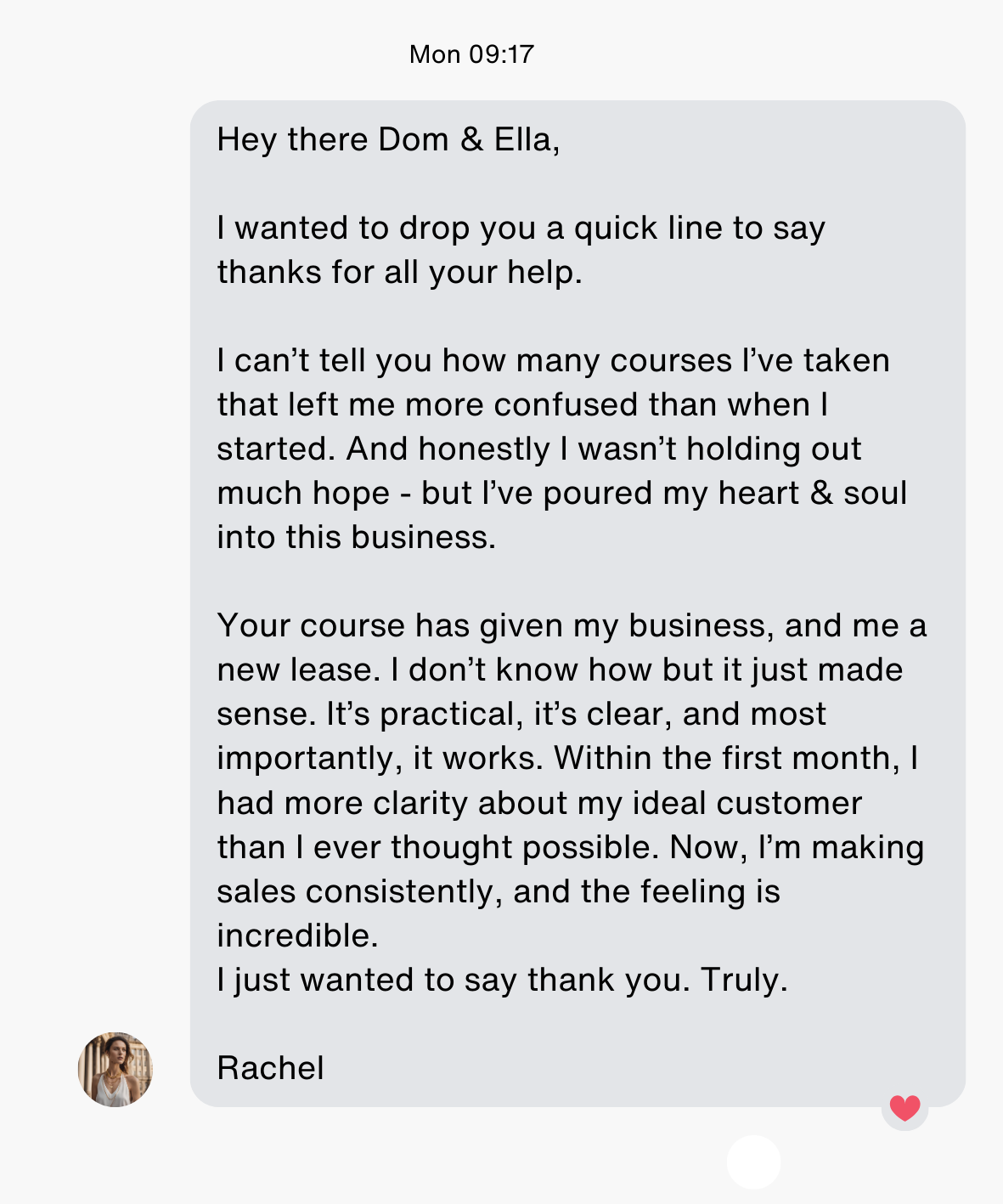 "I was at a breaking point with my business. I believed in my product, but sales were stagnant, and I was honestly starting to doubt myself. Then I found Dom and Ella’s course, and it was like a lightbulb moment. For the first time, I understood why my customers weren’t buying and exactly what I needed to do. Within weeks, I started seeing results—real demand and, finally, the sales I’d been working so hard for. If you’re ready to transform your business, this is the roadmap you need."